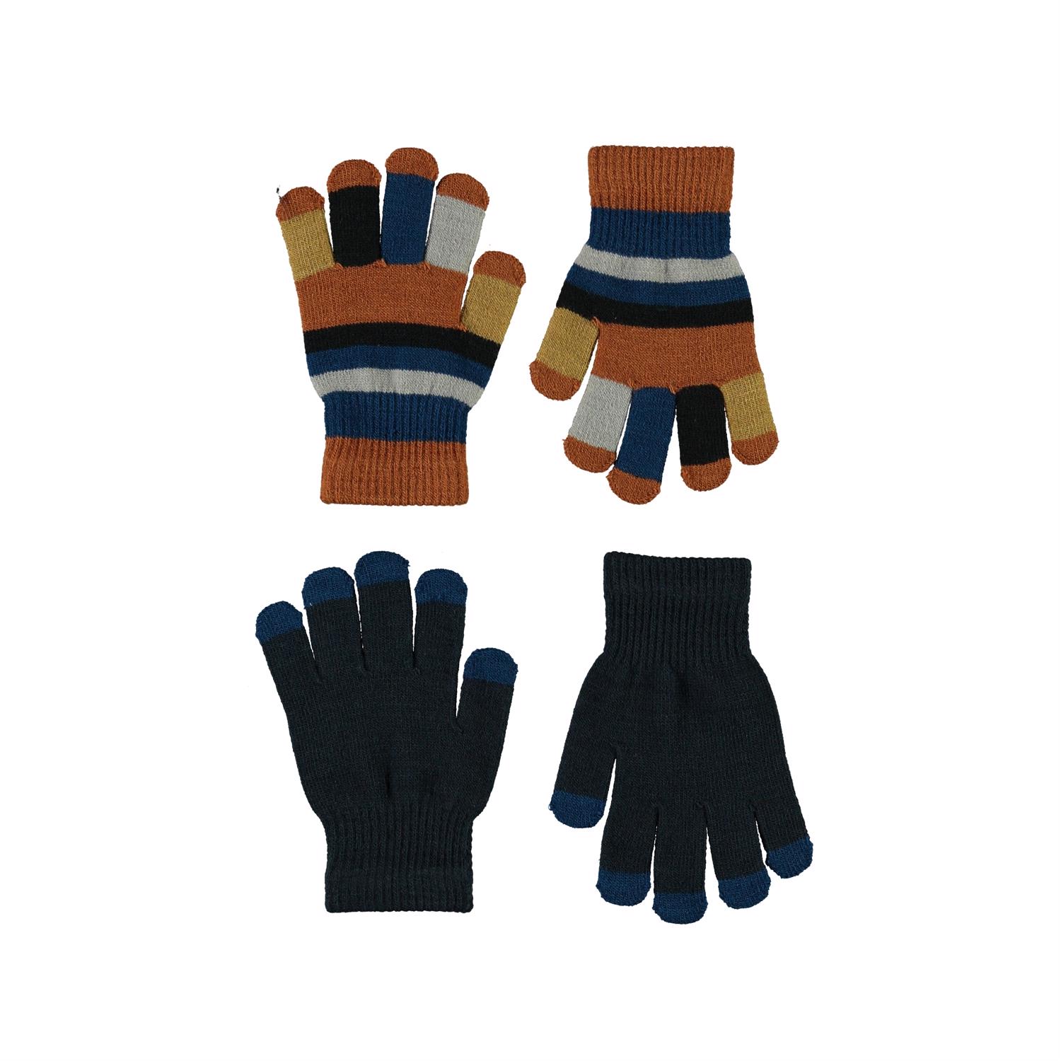 2 Paar gebreide handschoenen. Een paar is donkerblauw met blauwe vingertoppen en de ander is gestreept.
