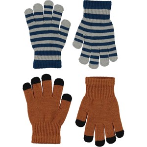 2 Paar gebreide handschoenen. Een paar is bruin met zwarte vingertoppen en de ander is blauw en grijs gestreept.
