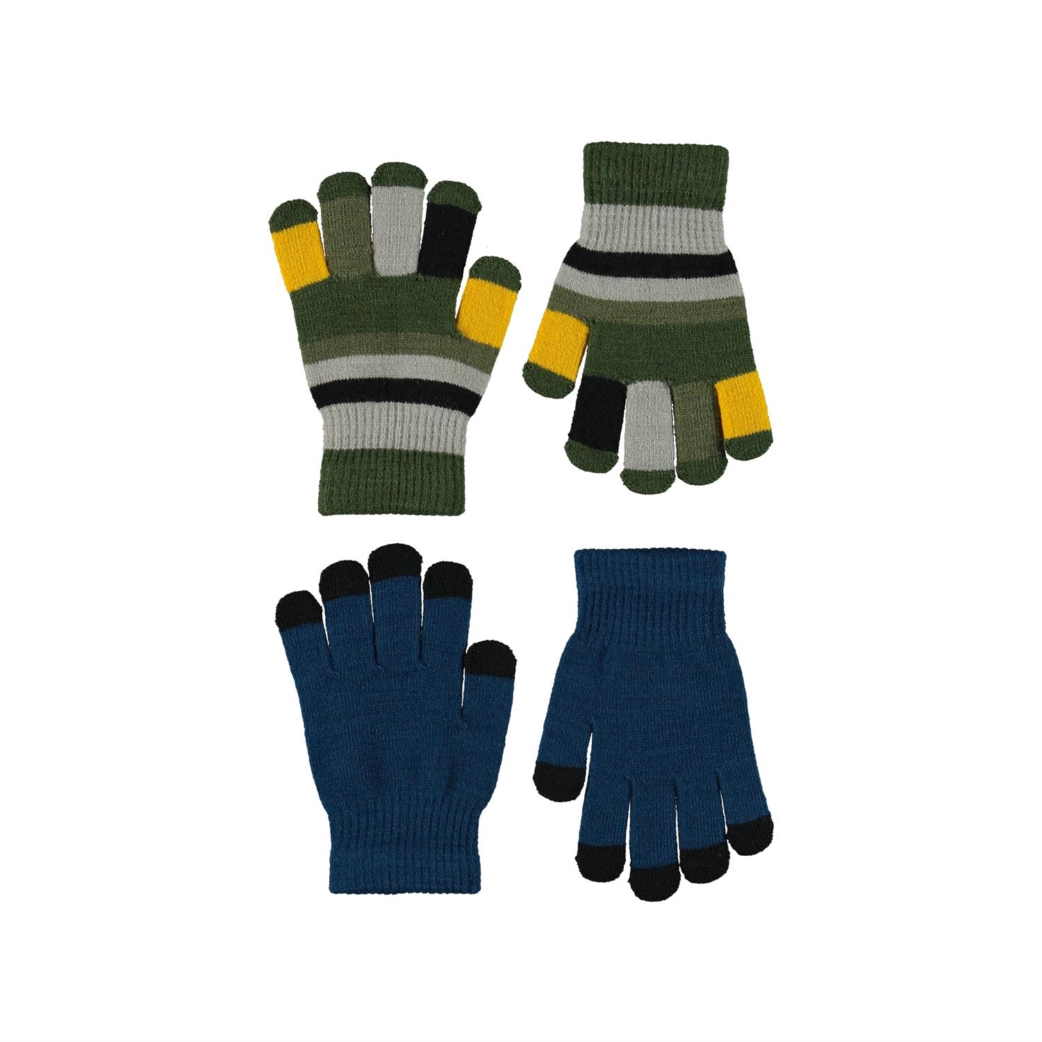 2 Paar gebreide handschoenen. Een paar is in het blauw met zwarte vingertoppen en de ander is gestreept.