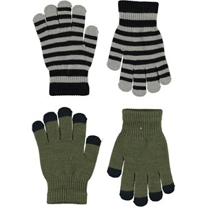 2 Paar gebreide handschoenen. Een paar is groen met zwarte vingertoppen en de ander is zwart en grijs gestreept.