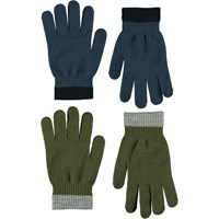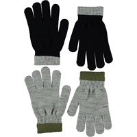 Twee paar gebreide handschoenen. Het ene paar is donkerbruin met een grijze gebreide rand bij de polsen en het andere paar is lichtpaars en bruin.