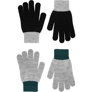 Duopak gebreide handschoenen. Een paar is zwart met grijze details, terwijl het andere paar grijs is met groene details. De handschoenen hebben een geribbelde manchet rond de pols, waardoor ze comfortabel zijn om te dragen en het voorkomt dat ze makkelijk uitgaan.