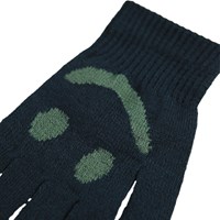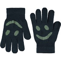 Dup pak gebreide handschoenen voor iets oudere kinderen. Het ene paar is groen en zwart enl het andere paar is donkergroen met een lichtgroen lachend gezicht. De handschoenen hebben een geribbelde boord rond de pols waardoor het comfortabel is om te dragen en het voorkomt dat de handschoenen van de hand afglijden.