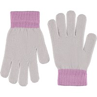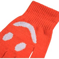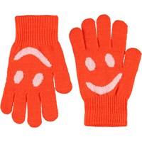 Duo pak gebreide handschoenen voor iets oudere kinderen. Het ene paar is grijs en paars enl het andere paar is rood met een beige glimlachend gezicht. De handschoenen hebben een geribbelde boord rond de pols waardoor het comfortabel is om te dragen en het voorkomt dat de handschoenen van de hand afglijden.