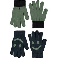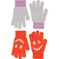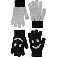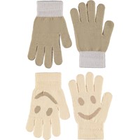 Duo pak gebreide handschoenen voor iets oudere kinderen. Het ene paar is grijs en khaki en het andere paar is gebroken wit met een lachend gezicht. De handschoenen hebben een geribbelde boord rond de pols waardoor het comfortabel is om te dragen en het voorkomt dat de handschoenen van de hand afglijden.