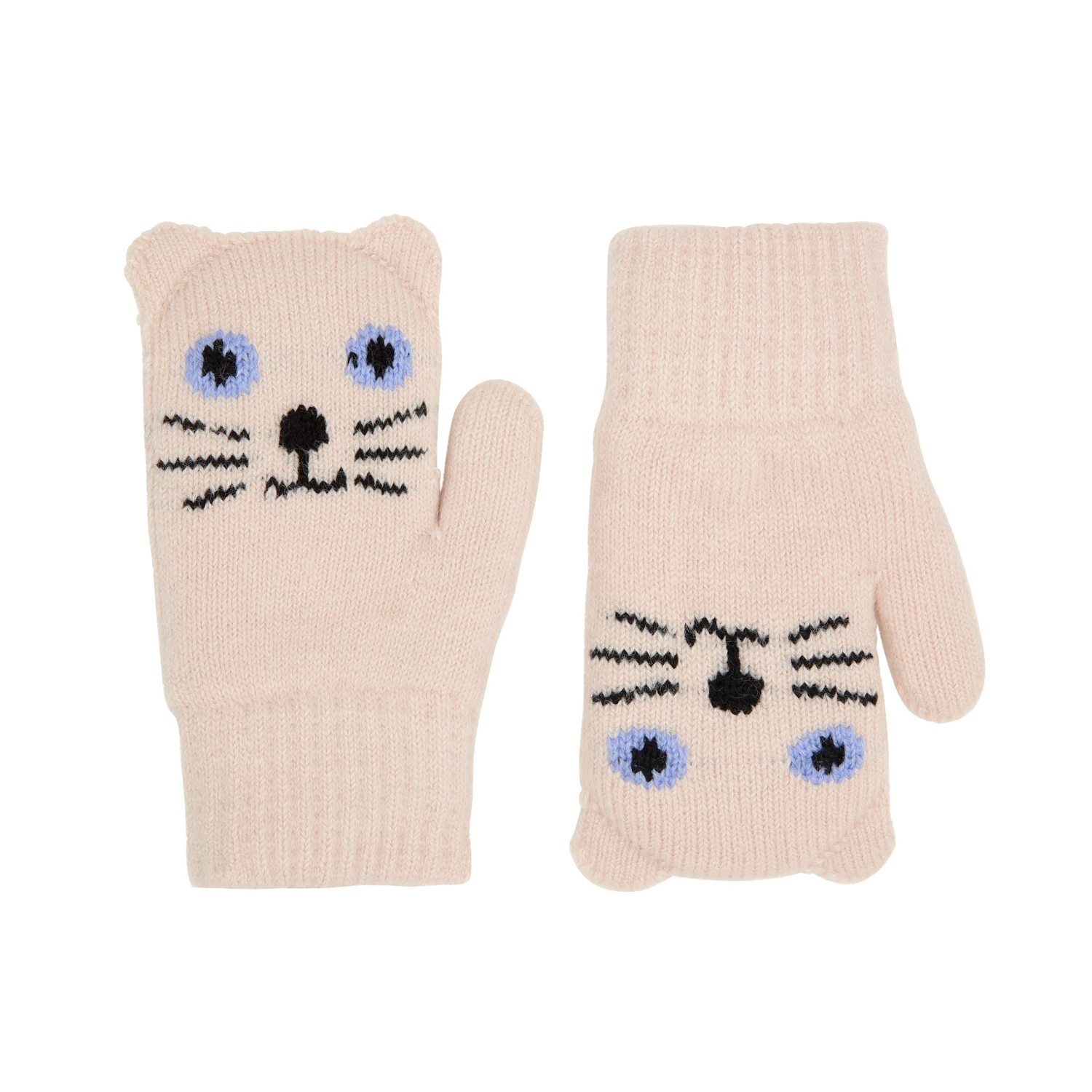 Gebroken witte gebreide wanten voor baby's en peuters met een schattig kattengezicht. De wanten hebben een geribbelde boord rond de pols, wat zorgt voor een goede pasvorm, en een zachte fleece voering om de handen warm te houden.