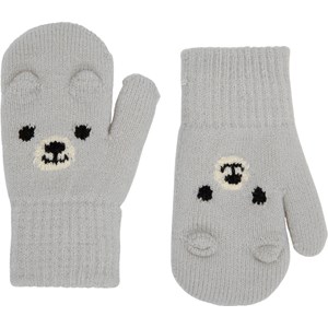 Lichtgrijze gebreide wanten voor baby's en peuters met een teddybeer gezicht. De wanten hebben een geribbelde boord rond de pols, wat zorgt voor een goede pasvorm, en een zachte fleece voering om hun handen warm te houden.