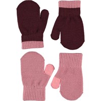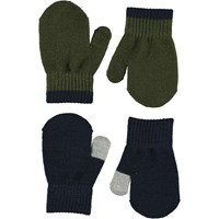 Twee paar gebreide babywanten in mosterdgeel en grijs.