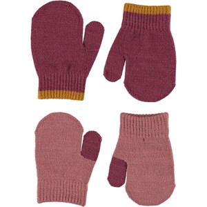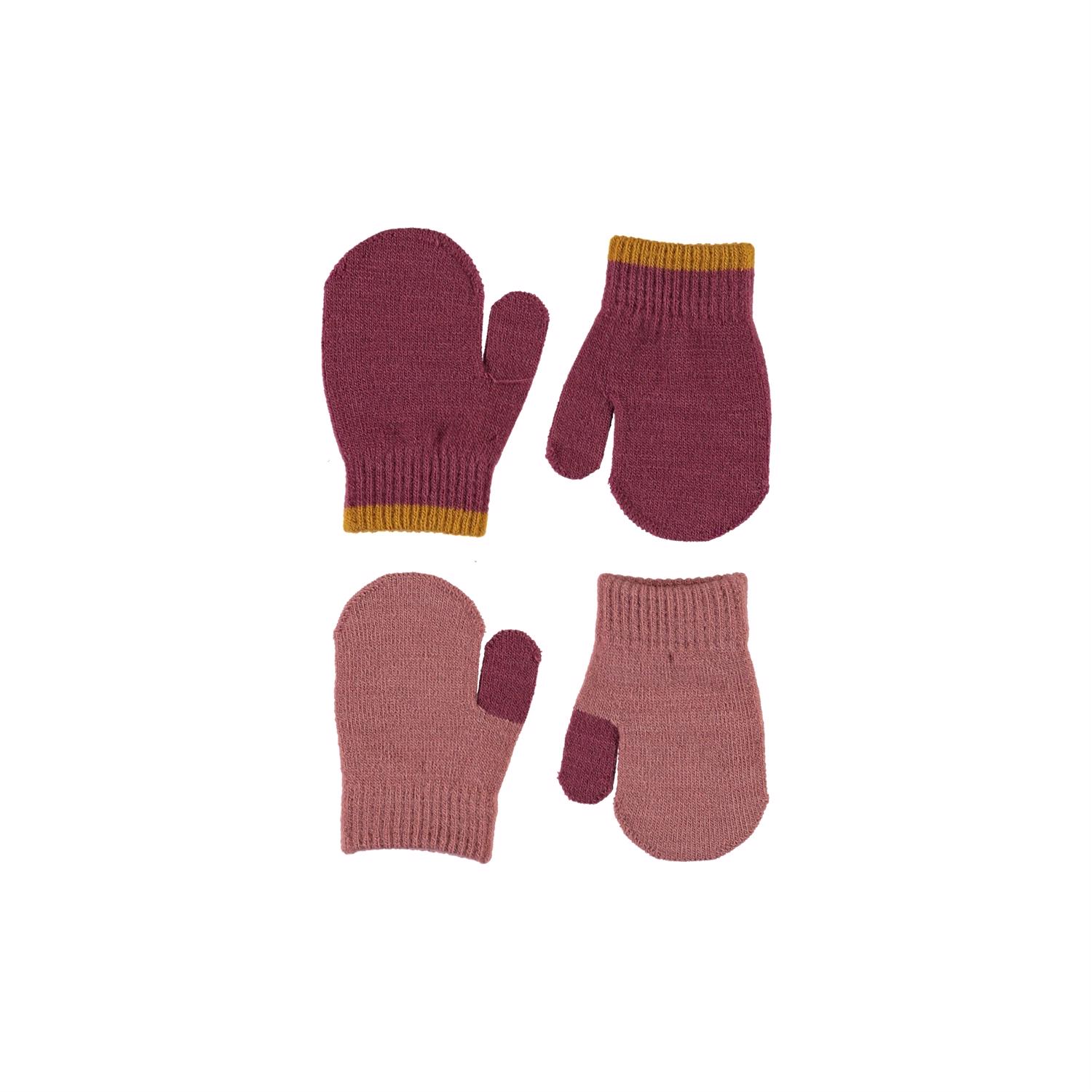 2 paar babywanten in roze met gele details en in roze met hardroze details.