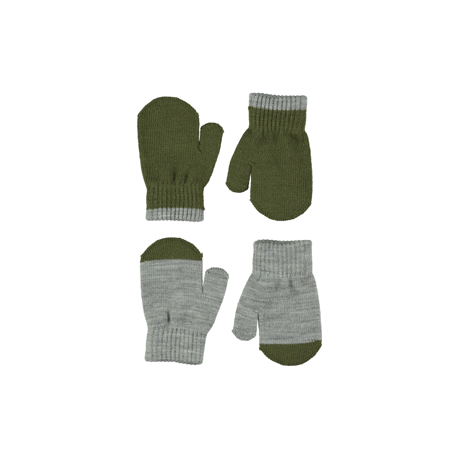Twee paar gebreide baby wanten in grijs en groen.