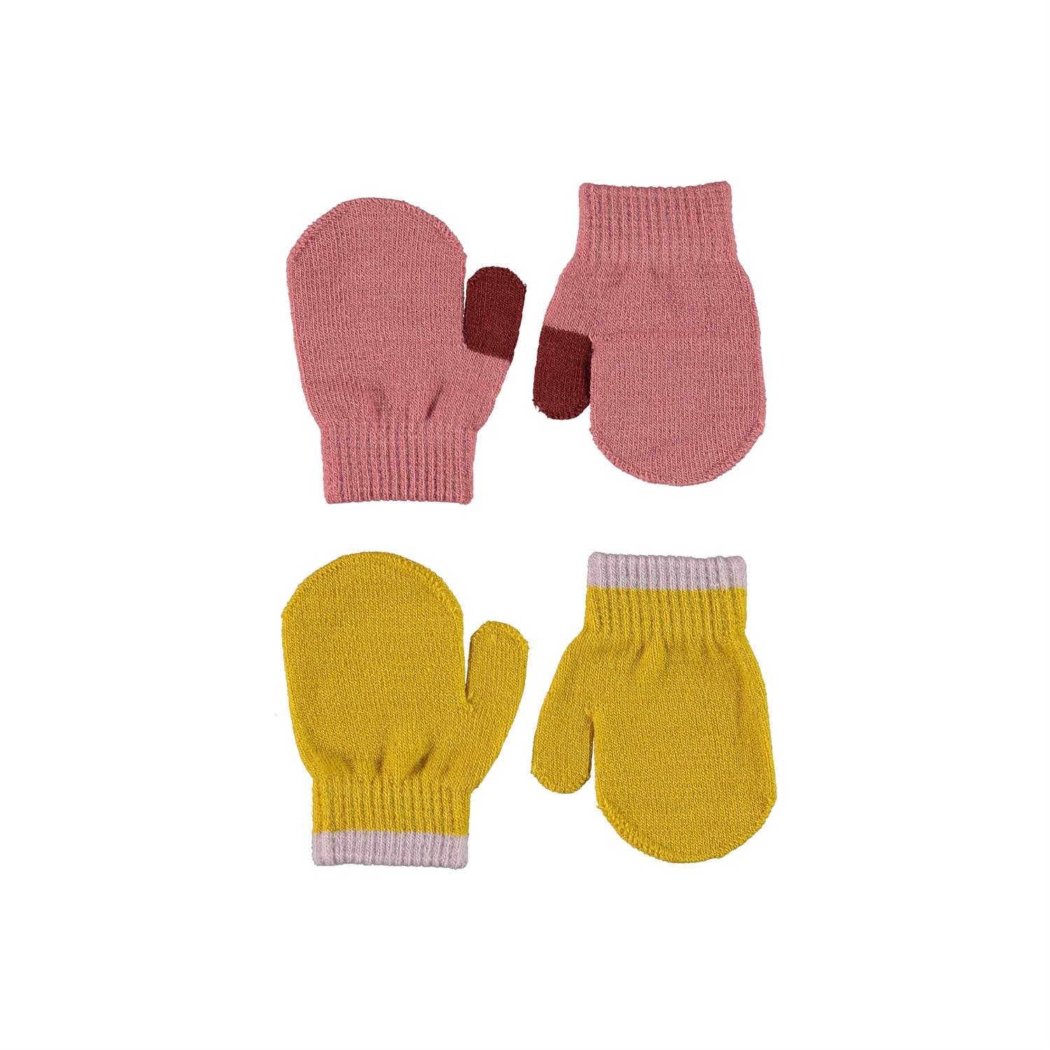 2 Paar baby wanten in roze en geel. Het roze paar heeft een rode duim, terwijl het gele paar een grijze boord heeft.