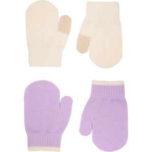 Duopak gebreide wanten voor baby's en peuters in gebroken witte en paarse kleuren. De wanten hebben een geribbelde boord rond de pols, wat ervoor zorgt dat ze op hun plaats blijven en niet van de hand afglijden.