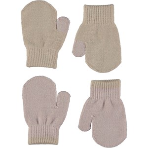Twee paar gebreide baby wanten in het beige en lichtroze.