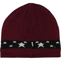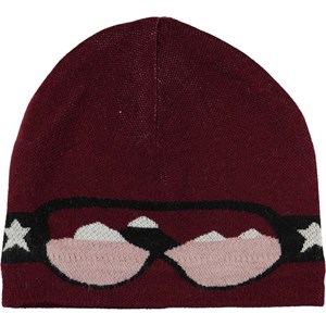Bordeaux rode gebreide muts met een coole skibril motief aan de voorkant.