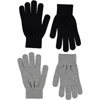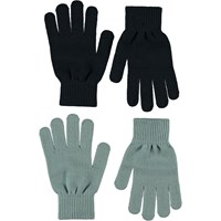 Twee paar gebreide handschoenen. Het ene paar is groen en het andere lichtpaars.