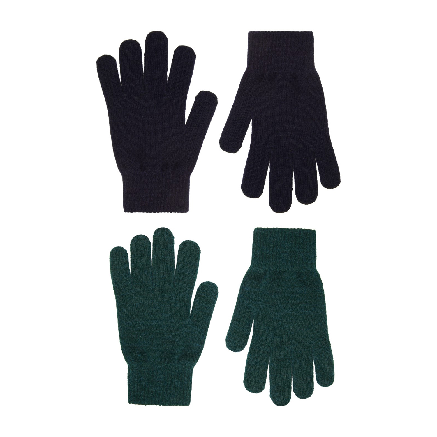 Duopak gebreide handschoenen in zwart en zeegroen. De handschoenen hebben een geribbelde manchet rond de pols, waardoor ze comfortabel zijn om te dragen en voorkomen dat ze van de hand afglijden.