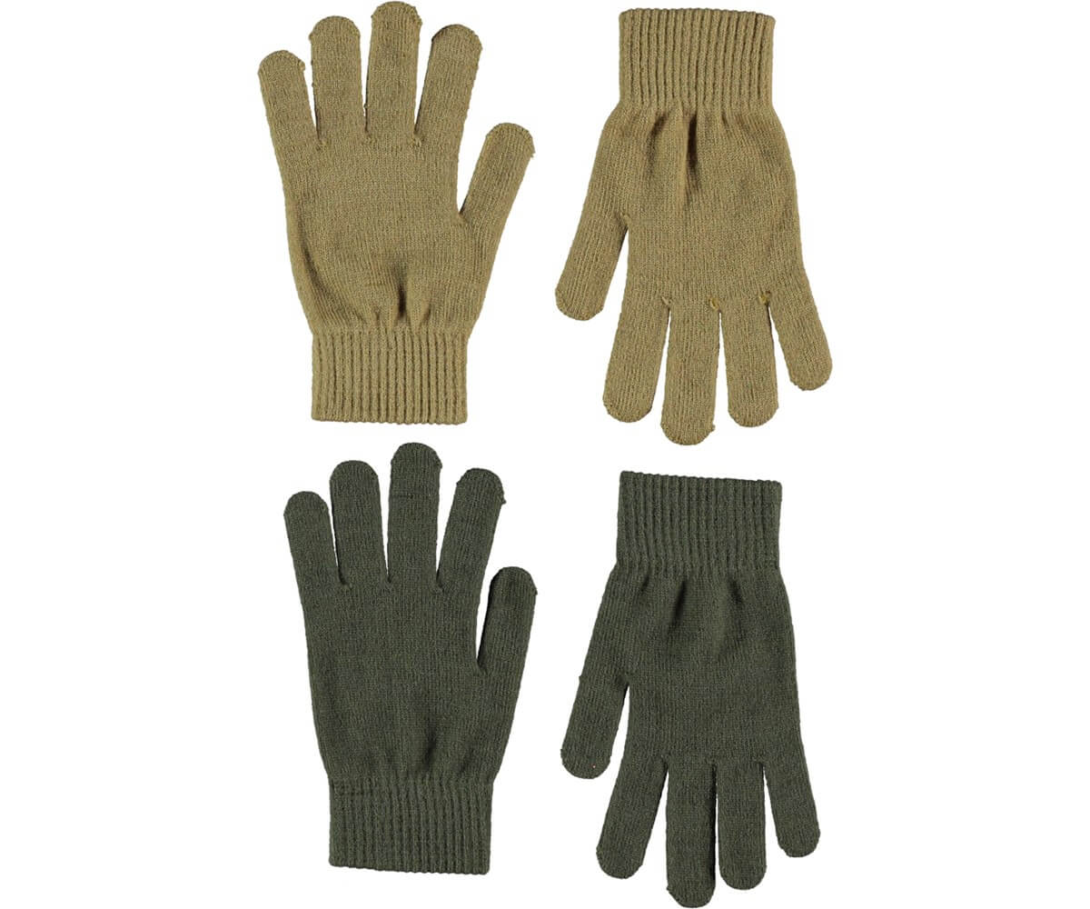 Twee paar gebreide handschoenen. Een paar is lichtgroen en de andere is donkergroen.