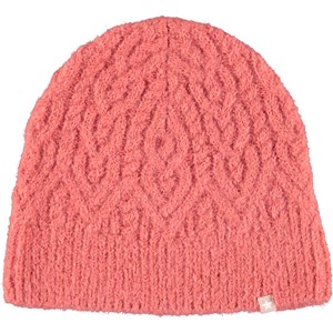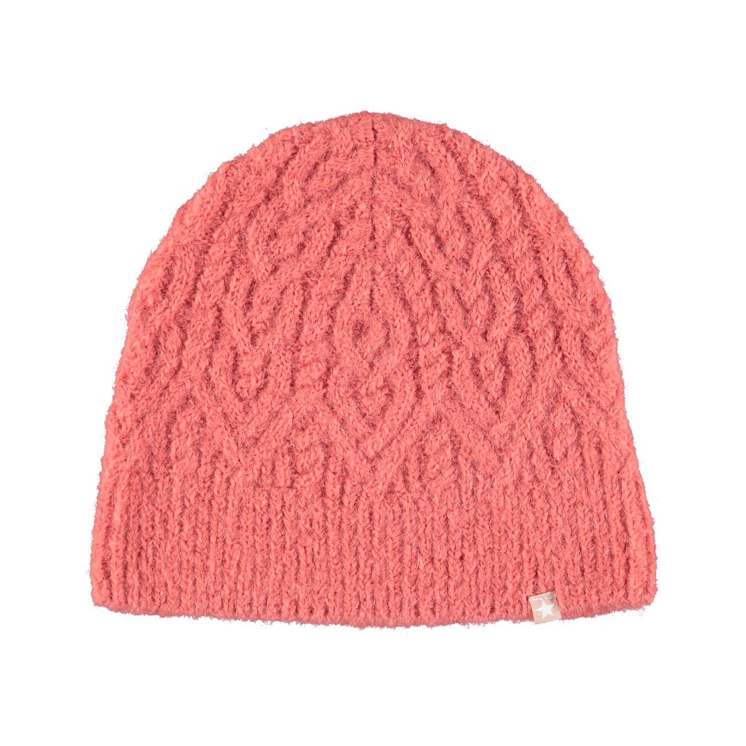 Lichtroze gebreide muts in alpaca wol. De muts heeft een prachtig patroon.