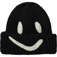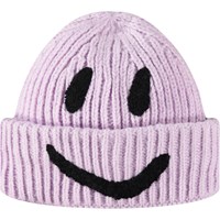 Ribgebreide muts in het paars met omslag en geborduurde glimlach in het zwart.