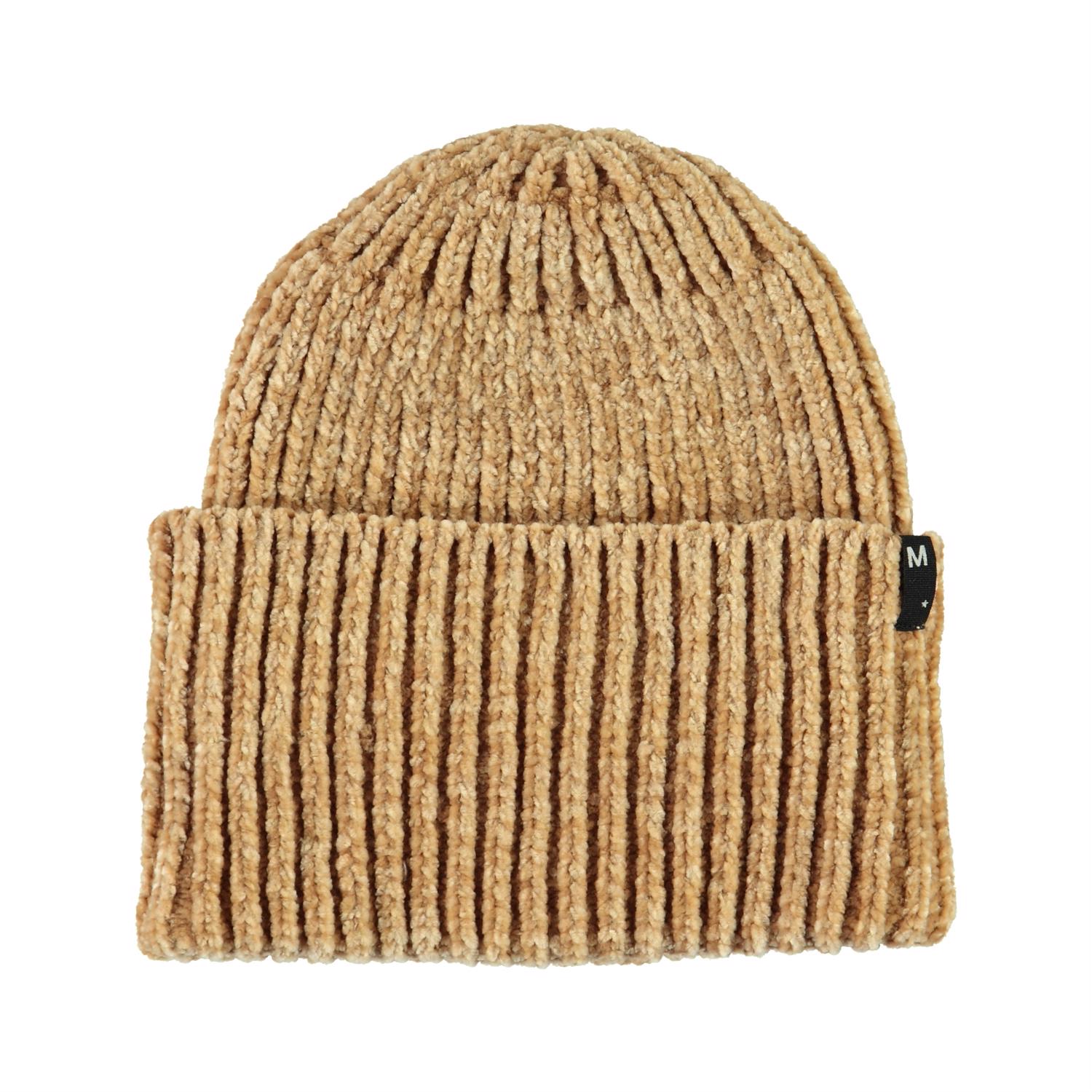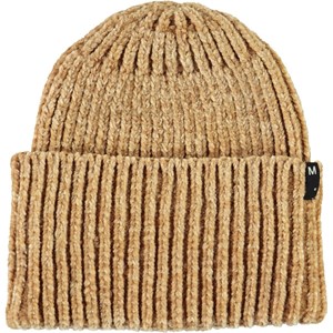 Gouden gebreide muts in mooie chenille wol met een brede omslag.