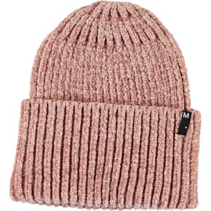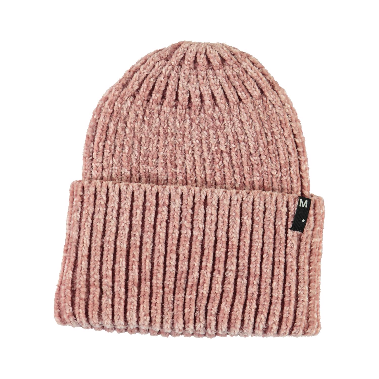 Roze gebreide muts in mooie chenille wol met een brede omslag.
