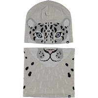 Zwarte muts en colsjaal van wol met een tijgermotief, dat deels op de muts en deels op de sjaal staat.