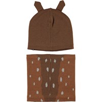 Bruine muts en colsjaal van wol met een motief van een hert, dat deels op de muts en deels op de sjaal staat.
