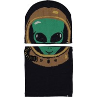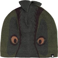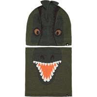 Groene muts en infinity sjaal van wol met een motief van een dinosaurus, dat deels op de muts en deels op de sjaal zit.