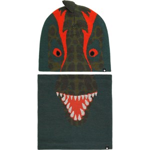 Set met muts en infinity sjaal voor kinderen in een wolmix met dinosaurus ontwerp.