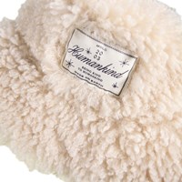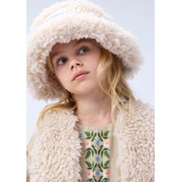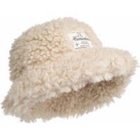 Prachtige roomkleurige fluffy buckethoed in nepbontstijl. Deze buckethoed heeft een brede rand en een patch met de tekst 'Humankind - Being Kind to Humankind'.