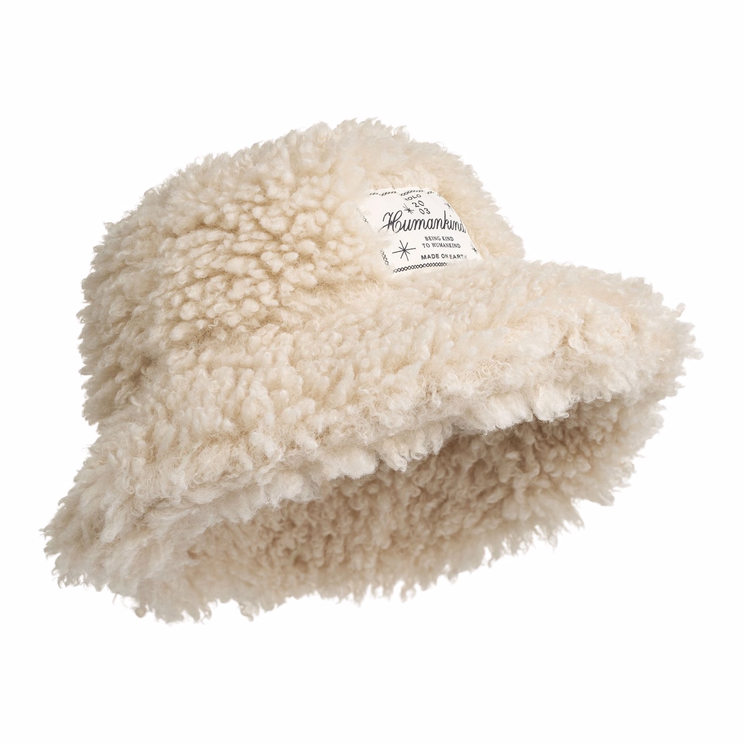 Prachtige roomkleurige fluffy buckethoed in nepbontstijl. Deze buckethoed heeft een brede rand en een patch met de tekst 'Humankind - Being Kind to Humankind'.
