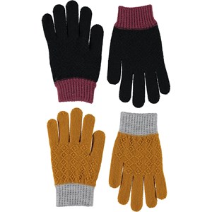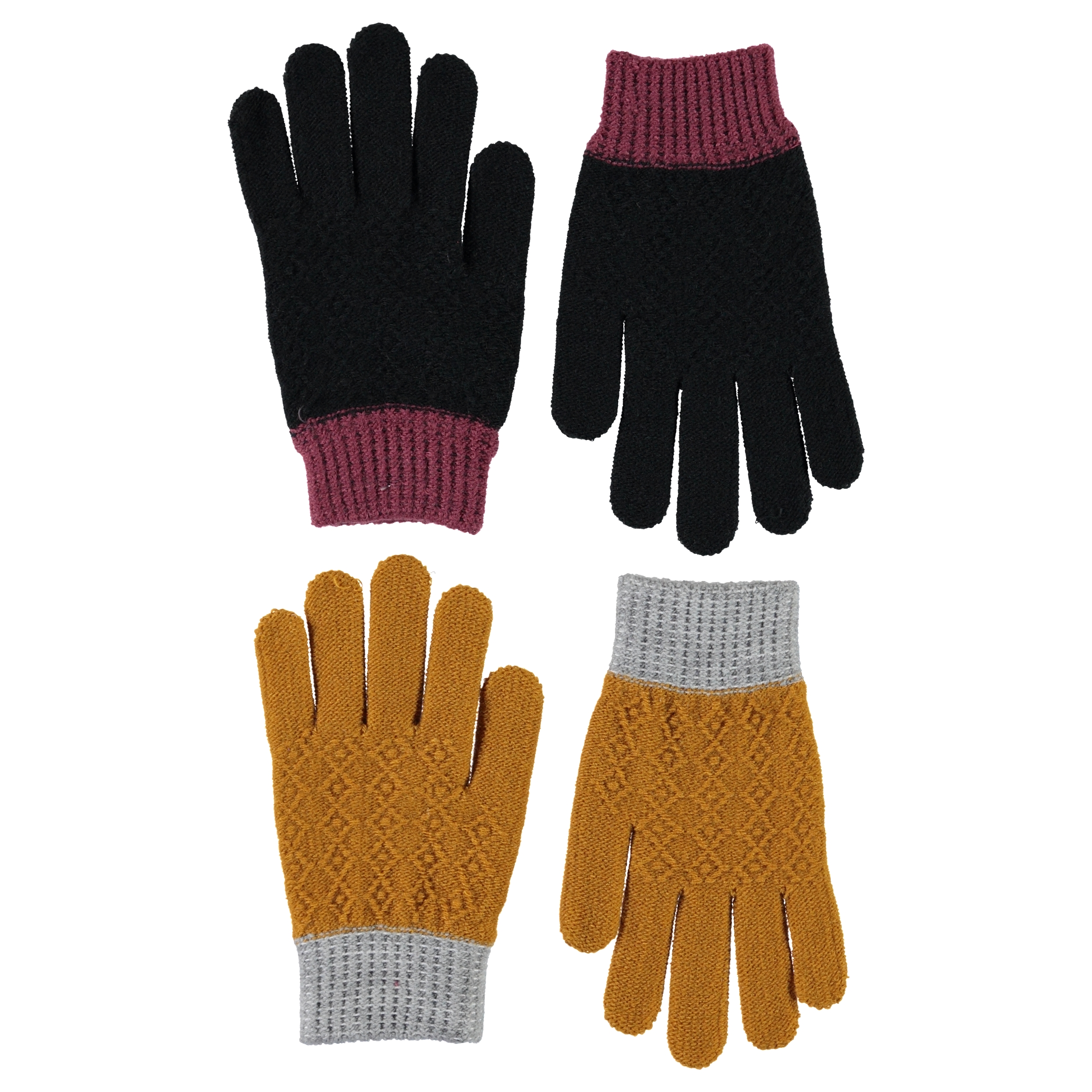 Twee paar gebreide handschoenen. Het ene paar is zwart en donkerroze, terwijl het andere donkergeel en grijs is.