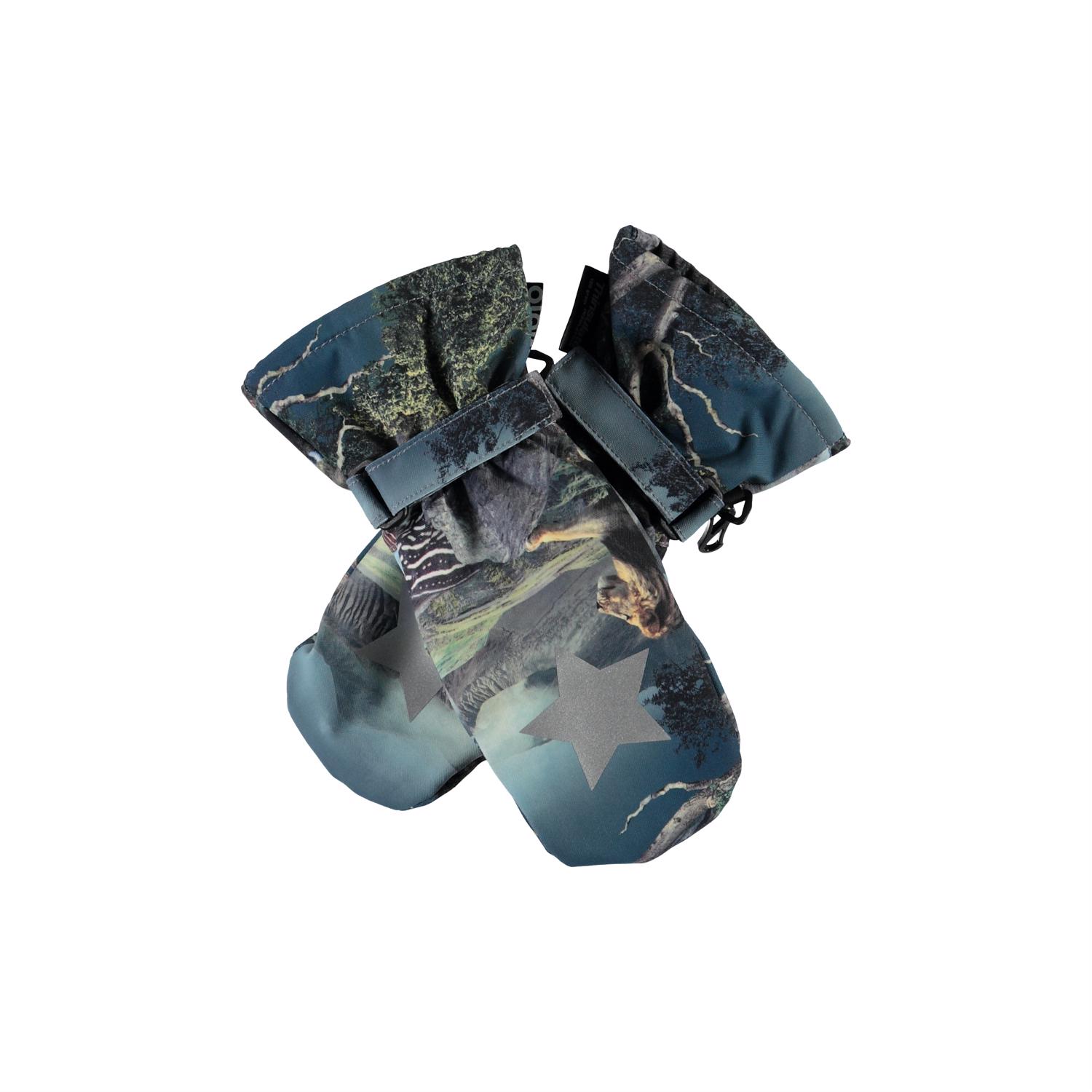 Waterdichte en ademende wanten met 3M ™ Thinsulate ™ isolatie. De wanten hebben een dierenprint en een sterreflector op de bovenkant van de hand. Ze hebben elastische en verstelbare klittenband bij de polsen. Dit product heeft een waterbestendige, PFC-vrije oppervlaktebehandeling (bevat geen bijv. PFOS, PFOA, enz.). Waterkolomdruk: 10.000 mm. Ademend: 8.000 g / m2 / 24 uur.