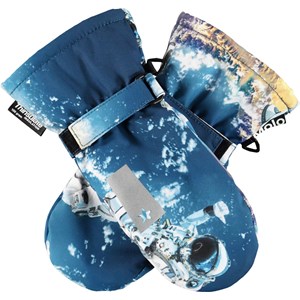 Blauwe waterdichte en ademende wanten met astronautenprint en met 3M™ Thinsulate™ voering. De wanten hebben Molo-reflectoren aan de bovenkant van de hand. Ze hebben elastisch en verstelbaar klittenband bij de polsen. De buitenstof is gemaakt van 45% gerecycled polyester, de 3M™ Thinsulate™ voering is gemaakt van 78% gerecycled polyester en de binnenstof is gemaakt van 100% gerecycled polyester. Dit product heeft een waterbestendige, PFC-vrije oppervlaktebehandeling (Bevat bijvoorbeeld geen PFOS, PFOA, etc). Waterkolomdruk: 10.000 mm. Ademend: 8.000 g/m2/24u. Maten 1-2 jaar hebben ook een ritssluiting aan de manchet.