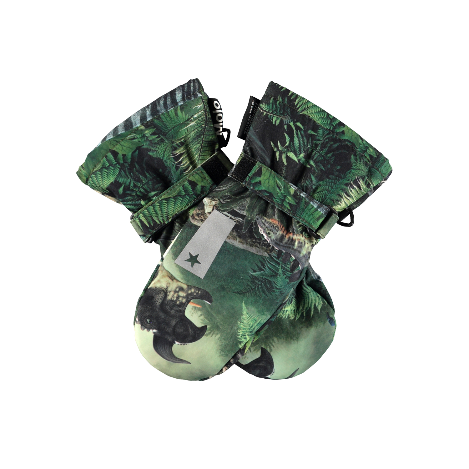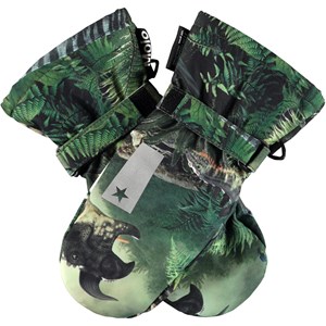 Groene waterdichte en ademende wanten met dinosaurusprint en met 3M™ Thinsulate™ voering. De wanten hebben Molo-reflectoren aan de bovenkant van de hand. Ze hebben elastisch en verstelbaar klittenband bij de polsen. De buitenstof is gemaakt van 45% gerecycled polyester, de 3M™ Thinsulate™ voering is gemaakt van 78% gerecycled polyester en de binnenstof is gemaakt van 100% gerecycled polyester. Dit product heeft een waterbestendige, PFC-vrije oppervlaktebehandeling (Bevat bijvoorbeeld geen PFOS, PFOA, etc). Waterkolomdruk: 10.000 mm. Ademend: 8.000 g/m2/24u. Maten 1-2 jaar hebben ook een ritssluiting aan de manchet.