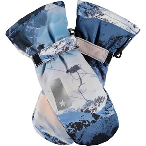 Blauwe waterdichte en ademende wanten met een print van een berglandschap en isolatie van 3M™ Thinsulate™. De wanten hebben een reflecterende strip aan de voorkant en elastiek en verstelbaar klittenband rond de pols.
