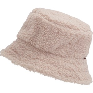 Zachte pluizige bucket hat in beige, die je hoofd warm houdt.