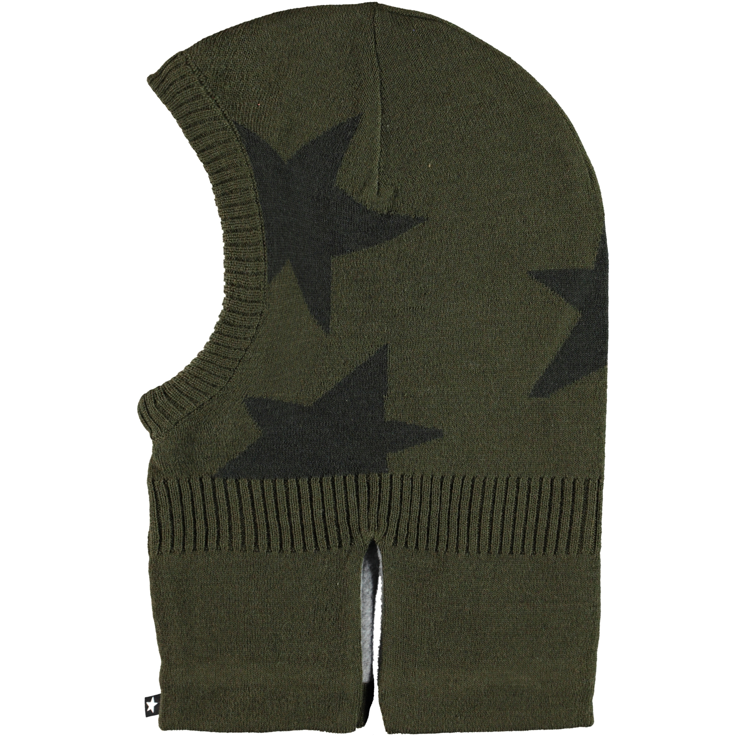 Groene bivakmuts in een zachte wolmix met intarsia sterren, een zachte fleece voering en een inkeping bij de hals waardoor de muts beter over de borst en schouders valt.