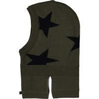 Zwarte bivakmuts met intarsia sterren. De muts is gemaakt van een zachte wolmix en is gevoerd met fleece. Het heeft spleten aan de zijkanten van de hals, zodat het goed over de schouders en borst past.