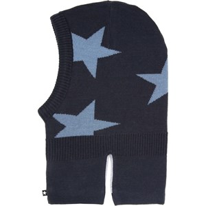 Donkerblauwe bivakmuts met blauwe intarsia sterren in een zachte wolmix met fleece voering. Het heeft inkepingen aan de zijkant van de hals zodat het goed over de borst en schouders past.