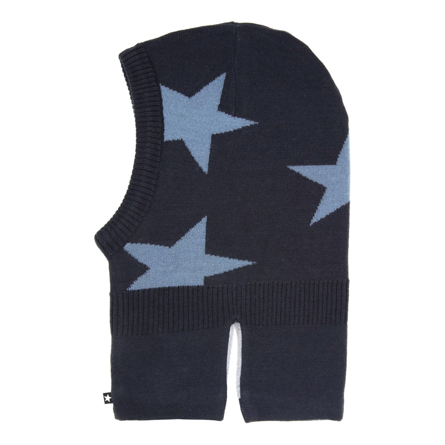 Donkerblauwe bivakmuts met blauwe intarsia sterren in een zachte wolmix met fleece voering. Het heeft inkepingen aan de zijkant van de hals zodat het goed over de borst en schouders past.