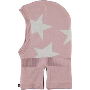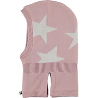 Roze skimuts van een zachte wol met intarsia-sterren, een zachte fleecevoering en splitten in de hals zodat het beter over de schouders en borst valt.