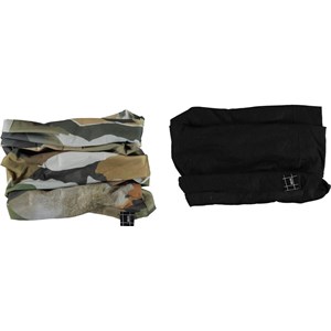 Twee colsjaals die het hele jaar door en op veel verschillende manieren gebruikt kunnen worden. De ene heeft een camouflageprint, de andere is zwart. Gebruik de colsjaals om de nek of trek ze over de oren omhoog.