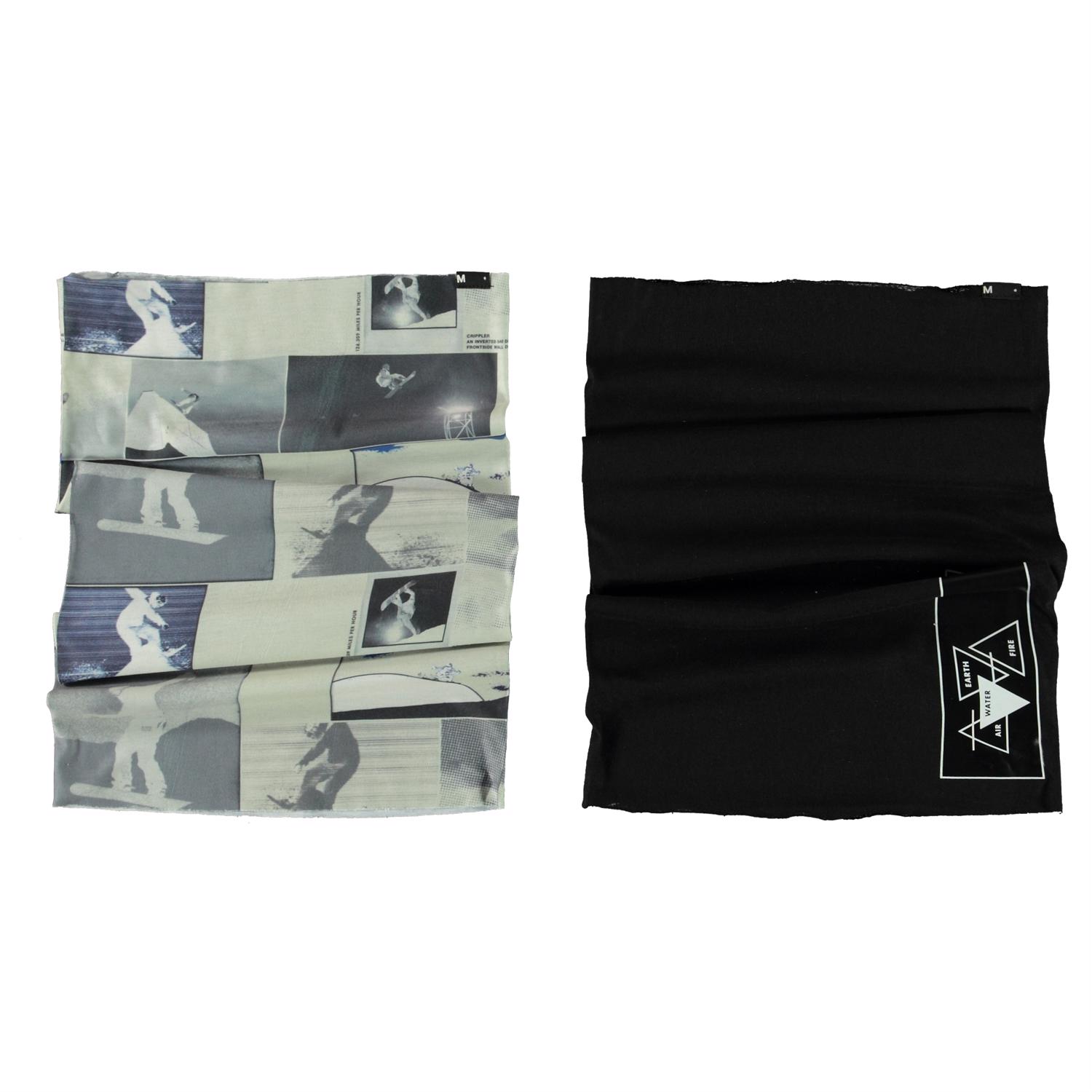 2 Colsjaals die het hele jaar door op veel verschillende manieren kunnen worden gebruikt. De ene is beige met een snowboarder print en de andere is zwart. Gebruik het rond de nek of trek het omhoog zodat het de oren bedekt.