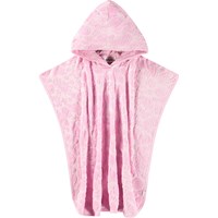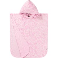 Roze badponcho met capuchon van zacht katoenen badstof met een patroon van exotisch fruit. De poncho is knielengte en open aan de zijkanten, waardoor gemakkelijke beweging mogelijk is. Het heeft ook een vaste capuchon met een grote opening, waardoor het gemakkelijk aan en uit te trekken is.