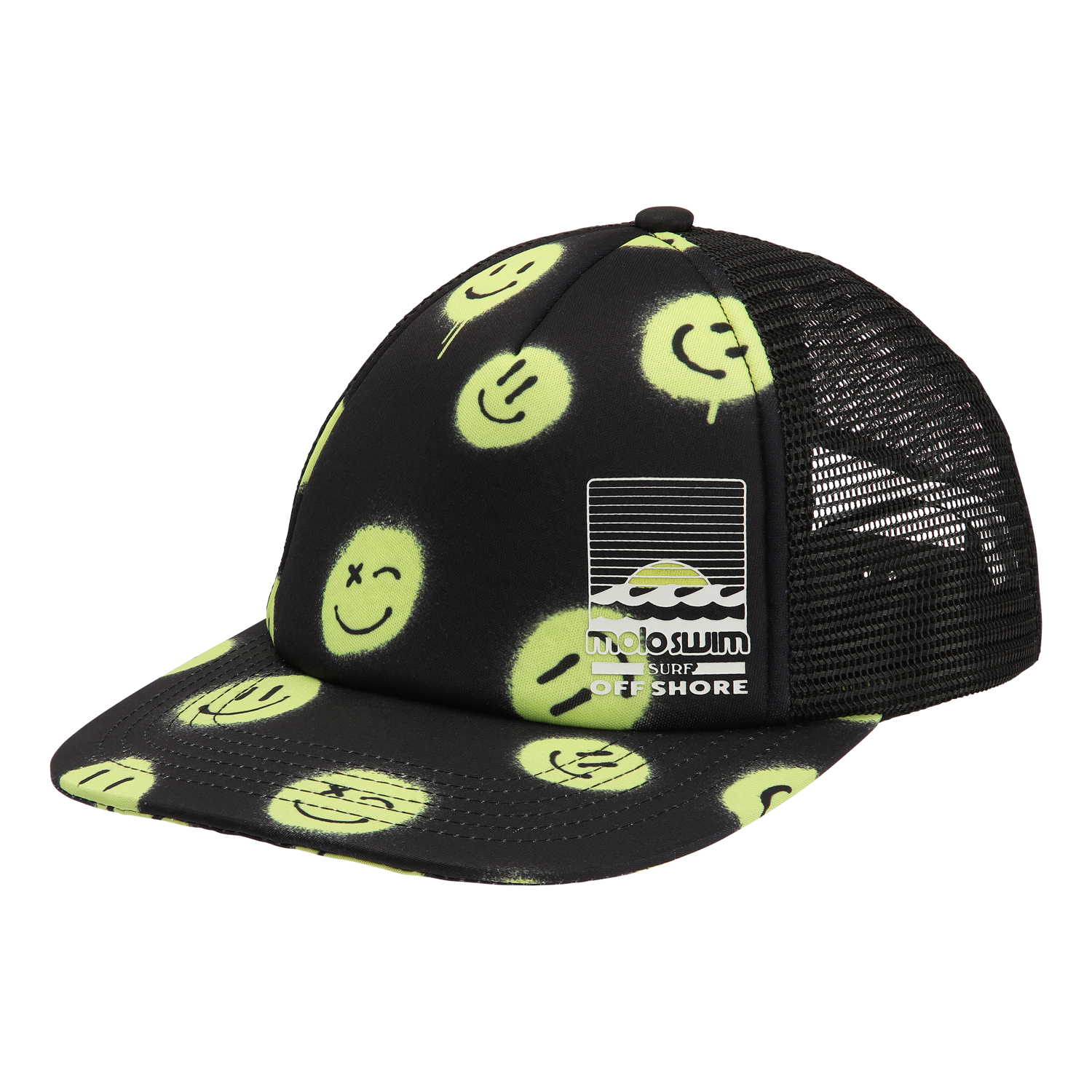 Stoere zwarte pet met een print van gele smiley’s. De pet heeft aan de achterkant gaas en kan hier versteld worden.
