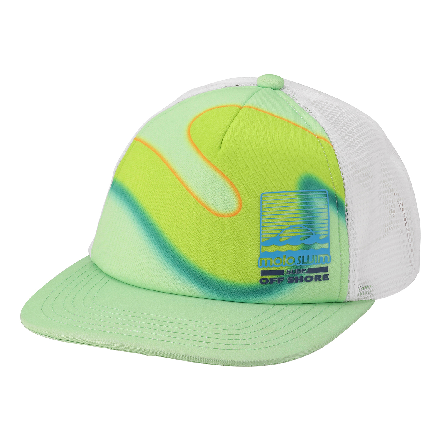 Stoere pet in groen en wit met een print van een limoenkleurige golf. De pet heeft gaas aan de achterkant en is aan de achterkant verstelbaar.