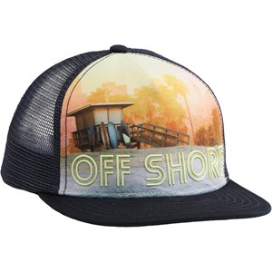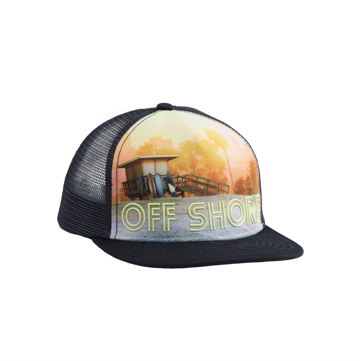 Stoere baseball cap met een print van een strand en palmbomen en de tekst 'Off shore'. De pet heeft gaas aan de achterkant en is verstelbaar.