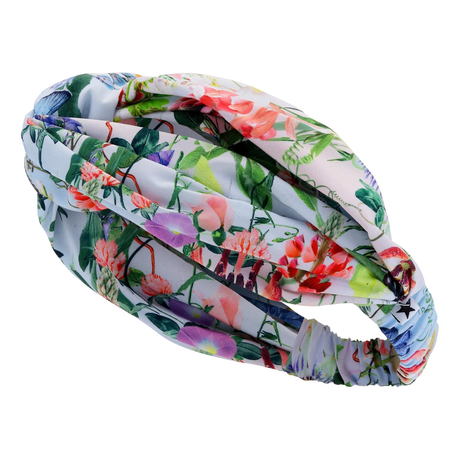 Lichtblauwe haarband met een bloemenprint die past bij Molo’s zwemkleding. Dit Molo product is gerecycled en gemaakt van 100% herbruikbaar polyester.