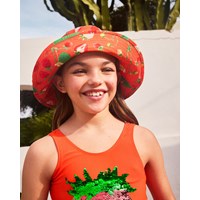 Buckethat van gerecycled nylon met UV-bescherming 50+. De buckethat heeft een normale pasvorm, een brede rand met padding en is ideaal om mee te nemen naar het water, omdat het materiaal snel droogt. De buckethat is rood met een print van verse aardbeiplanten.